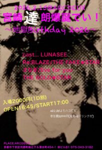 2月スケジュール 2026年 LIVE HOUSE ARCDEUX 2月スケジュール ※公開情報は予告なく変更する場合もございますのでご了承ください。 2026/2/15(SUN) 宮崎達郎爆誕でい! ~地獄Birthday 2026~ cast LUNASEE /Re:BLAZE/THE FAKE★STAR さなぎ/Eve for you/ THE GOLD☆STAR OPEN16:45/START17:00 入場2000(1Drink代¥600-別途要)